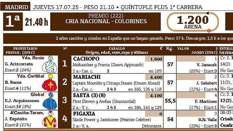 Como es habitual en el mes de julio, semana con tres días de carreras, el jueves y el sábado en La Zarzuela, el domingo en San Sebastián en horario vespertino. Adelantamos el programa para este jueves 17 de julio, soporte de las apuestas Quíntuple Plus y Lototurf.