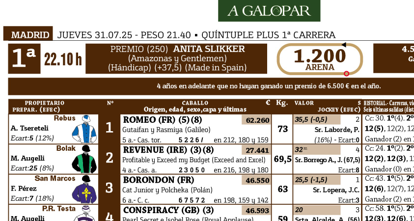 Carreras MadridPartant de A Galopar para el jueves 3 de agosto en HZ por agalopar29 de julio de 202529 de julio de 202503836 Compartir0 Les adelantamos nuestro estudio para las carreras nocturnas del jueves 3 de agosto en Madrid, con apuestas nacionales Quíntuple Plus y Lototurf. Programa de A Galopar para el jueves 3 de agosto