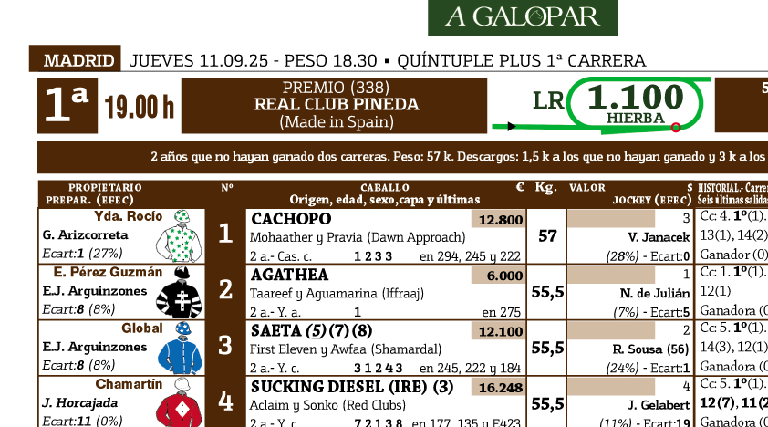 Carreras MadridPrograma de A Galopar para el jueves 11 de septiembre por agalopar7 de septiembre de 202510 de septiembre de 202503660 Compartir0 Adelantamos el estudio de las carreras del jueves 11 de septiembre en La Zarzuela, que incluiremos en nuestra próxima revista 133 digital. Descargue el programa de AG para el jueves 11