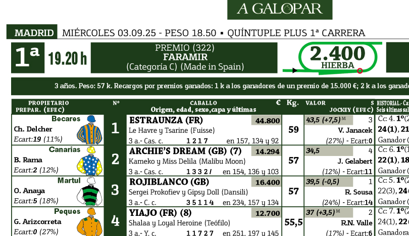 Les adelantamos el estudio de A Galopar para las carreras del miércoles 3 de septiembre, jornada inaugural del otoño en Madrid, que incluiremos próximamente en nuestro número 132 digital.